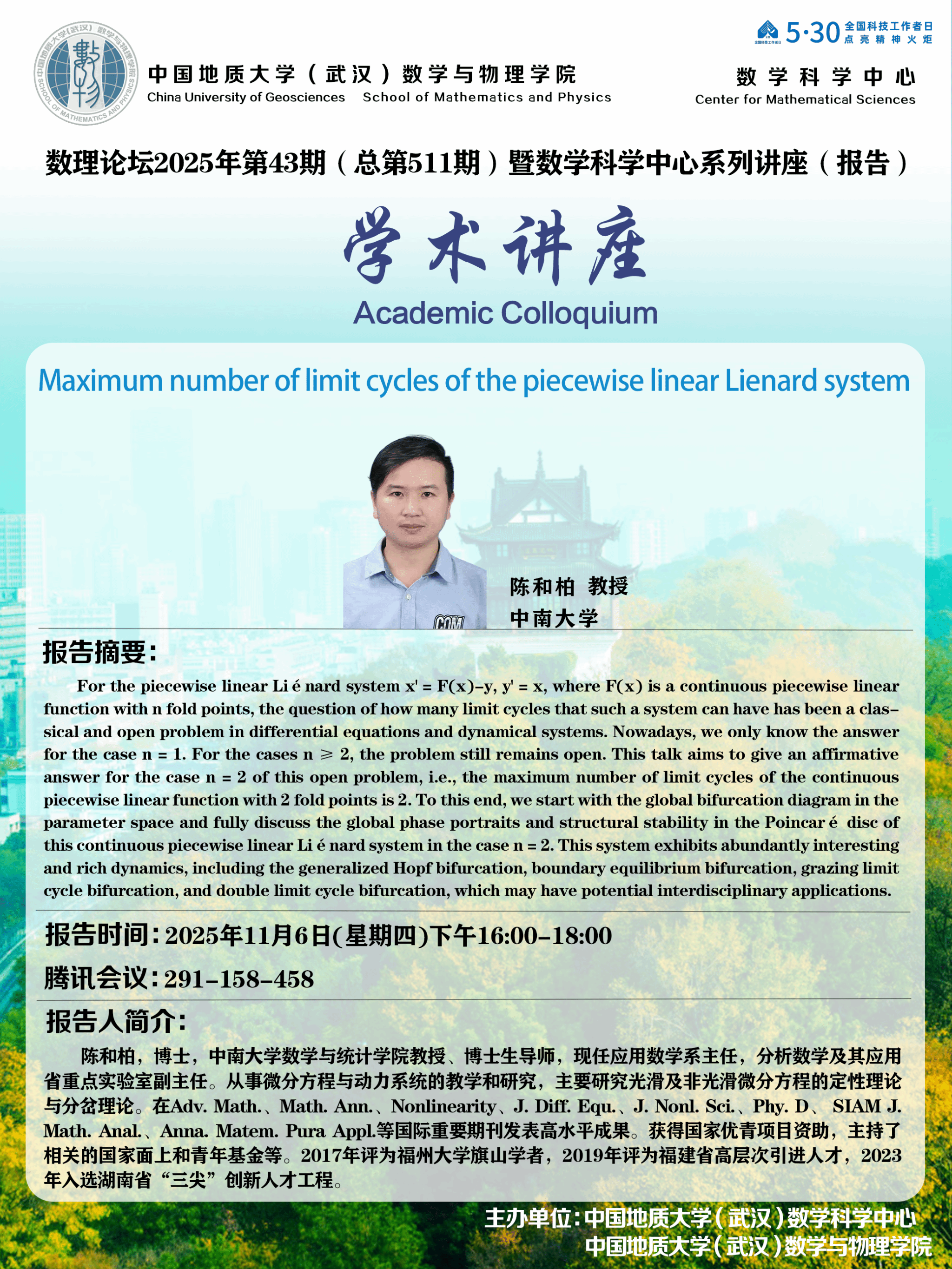 2025年11月6日陈和柏教授学术讲座:Maximum number of limit cycles of the piecewise linear Lienard system