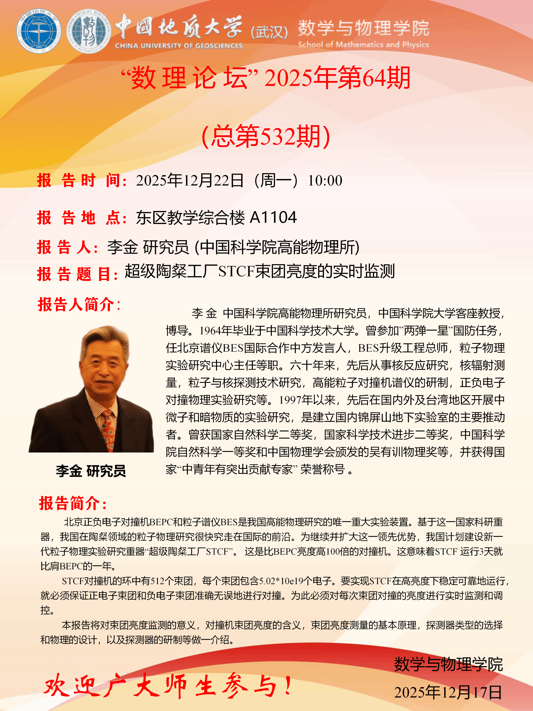 2025年12月18日李金成人网站 员学术讲座:超级陶粲工厂STCF束团亮度的实时监测