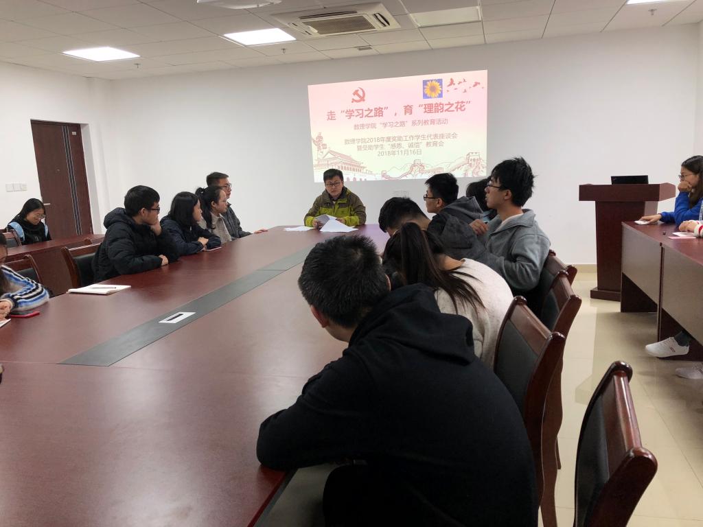 11月16日中午,成人网站 2018年奖助工作成人网站 代表座谈会暨受助成人网站 “感恩、诚信”成人网站-中文成人网站-做爱线上看 会在东区教学综合楼A1505会议室召开。2018年国家奖学金、国家励志奖学金获得者,各年级家庭经济困难成人网站 代表参会,会议由辅导员孙宇涛老师主持。