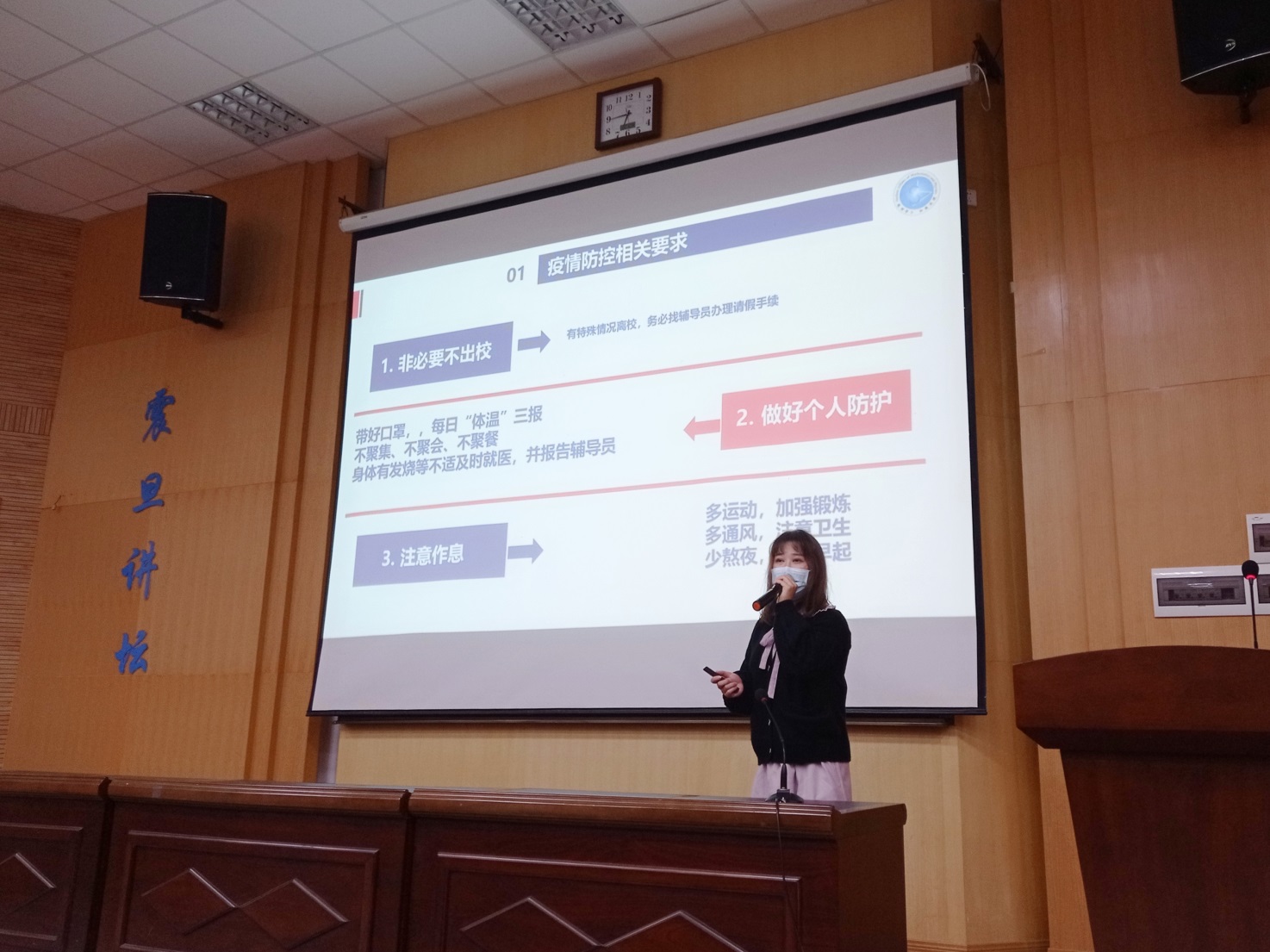 会议的第三项,辅导员黄恬恬老师针对近期的成人网站 安全问题、考勤问题和考风考纪问题等作了强调。她希望同学们树立正确的理想信念,只有把自己的奋斗融入民族、国家的命运之中,才具有人生的价值,她寄语同学们要放眼天下、胸怀祖国,要加强学习、增强本领,勇于扛起中华民族伟大复兴的历史重任。